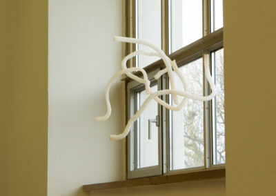 Diese Arbeit, in der unregelmäßige Kurven einer dünnen, lichtdurchlässigen Oberfläche miteinander verflochten sind, entstand aus der Frage: Was wäre, wenn ein Nachbild – das lediglich ein vorübergehendes elektrisches Phänomen ohne feste Form und Volumen ist – außerhalb der geschlossenen Augen in drei Dimensionen existieren würde?