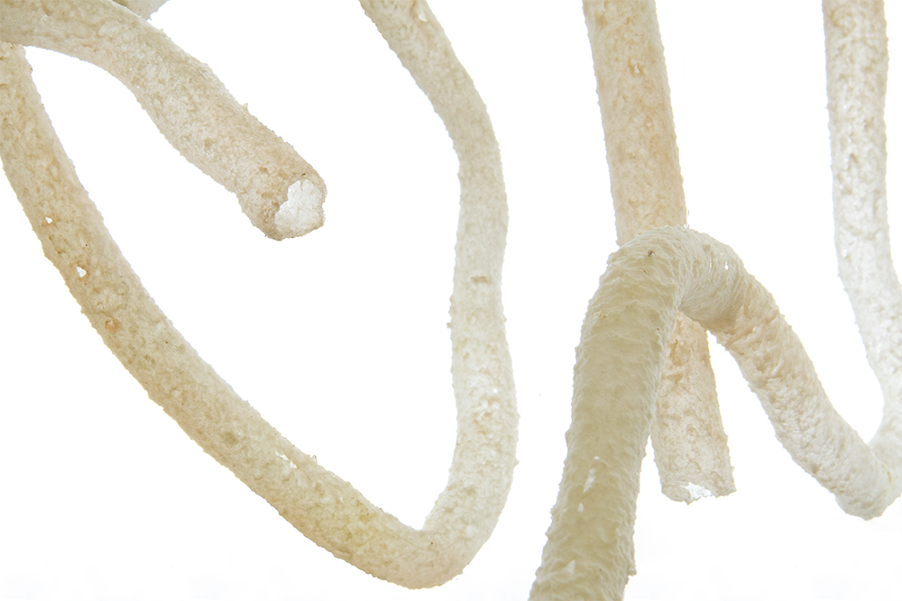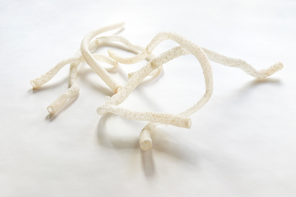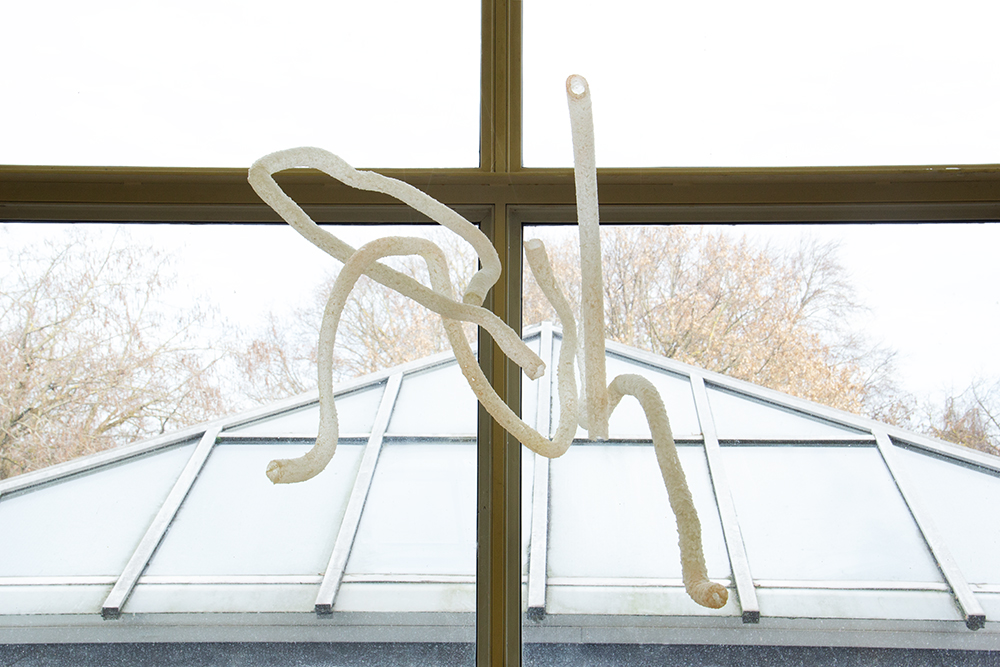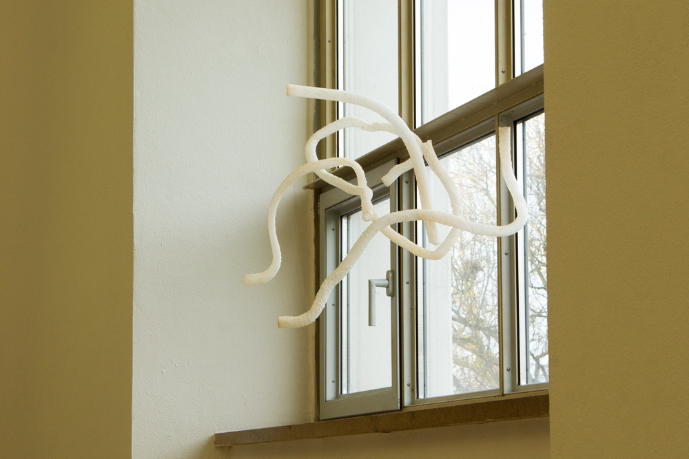 Diese Arbeit, in der unregelmäßige Kurven einer dünnen, lichtdurchlässigen Oberfläche miteinander verflochten sind, entstand aus der Frage: Was wäre, wenn ein Nachbild – das lediglich ein vorübergehendes elektrisches Phänomen ohne feste Form und Volumen ist – außerhalb der geschlossenen Augen in drei Dimensionen existieren würde?