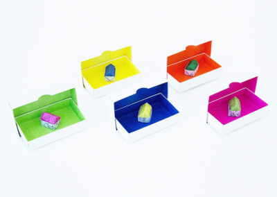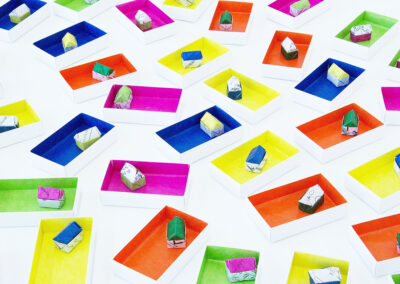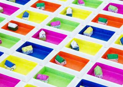 Die 40 Schachteln im Kunstautomaten „Konkret-o-mat“ des MKK Ingolstadt enthalten jeweils ein kleines dreidimensionales Origami. Man kann diese Schachtel für 5 € aus dem Automaten ziehen, ähnlich wie Gummibärchen oder Tabak. Für die Origamistücke wurden verschiedene alltags Papiere verwendet, darunter eine Seite aus einer Zeitschrift, die ich abonniert habe, mein Kontoauszug, eine Seite aus meinem Tagebuch und Memos. Die Frage „Kann in der heutigen Zeit jeder sein eigenes Zimmer, Wohnung, Haus – also seinen persönlichen Raum haben?“ ist für mich ein wichtiges Thema. Dieses kleine Origami ist nicht nur mein persönliches Räumchen, sondern auch ein kleines Räumchen, das ich den Käufer:innen anbiete.