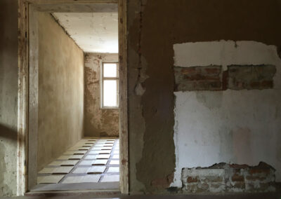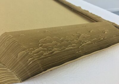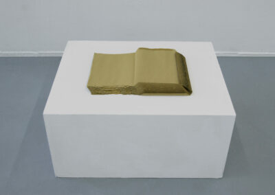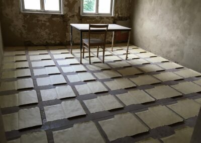 107 Blätter Umschläge liegen auf dem Boden der zwei Räume verteilt. Diese wurden mit dem Cutter zerrissen und zeigen völlig offen ihre Innenseite. Die geöffnete Form erinnert an einen Grundriss eines Raumes. Diese Arbeit ist inspiriert von meiner eigenen Lebenserfahrung, in der ich versuchte, mich anzupassen, indem ich mich zunächst neuen Umgebungen und Menschen öffnete.