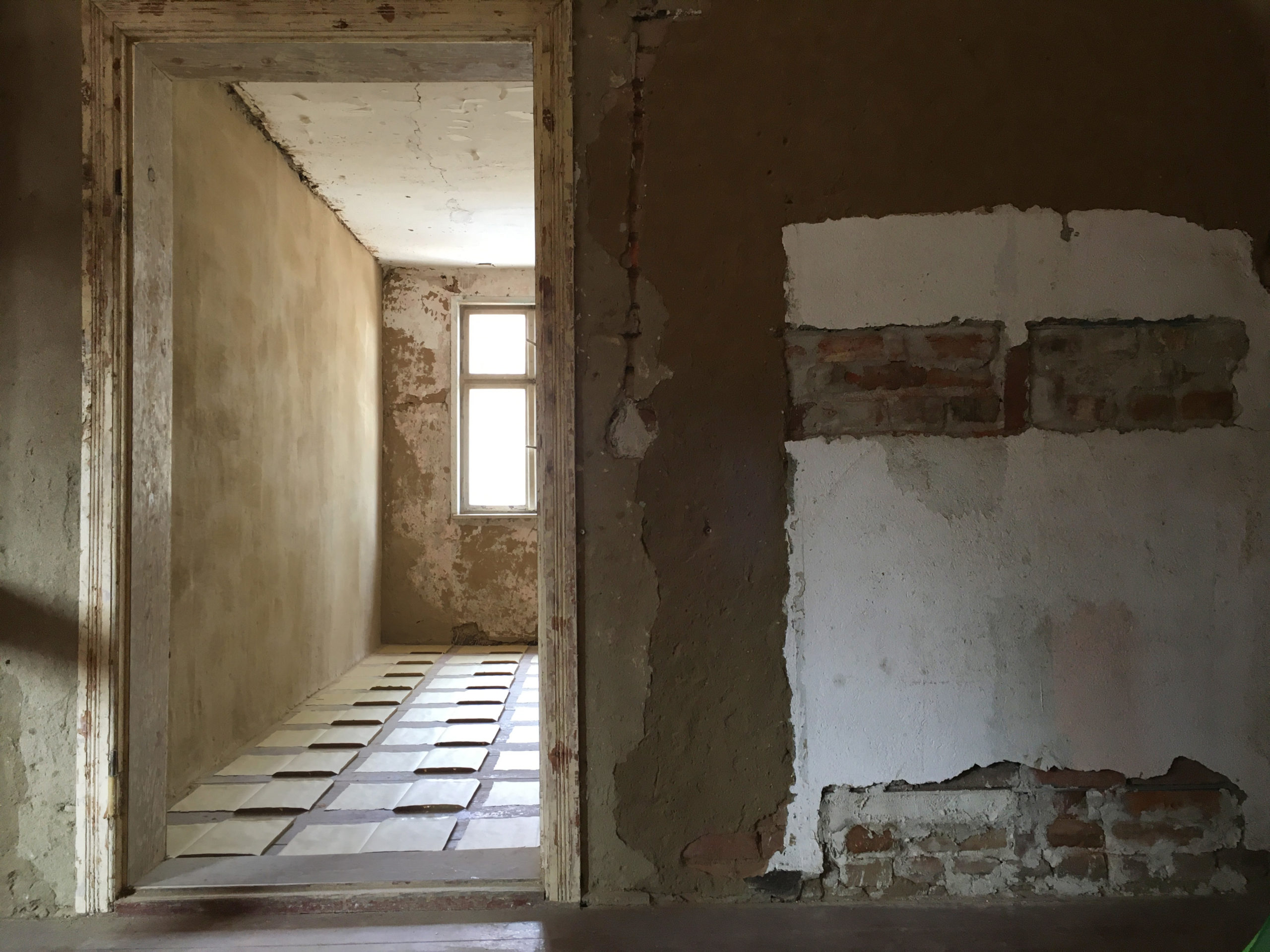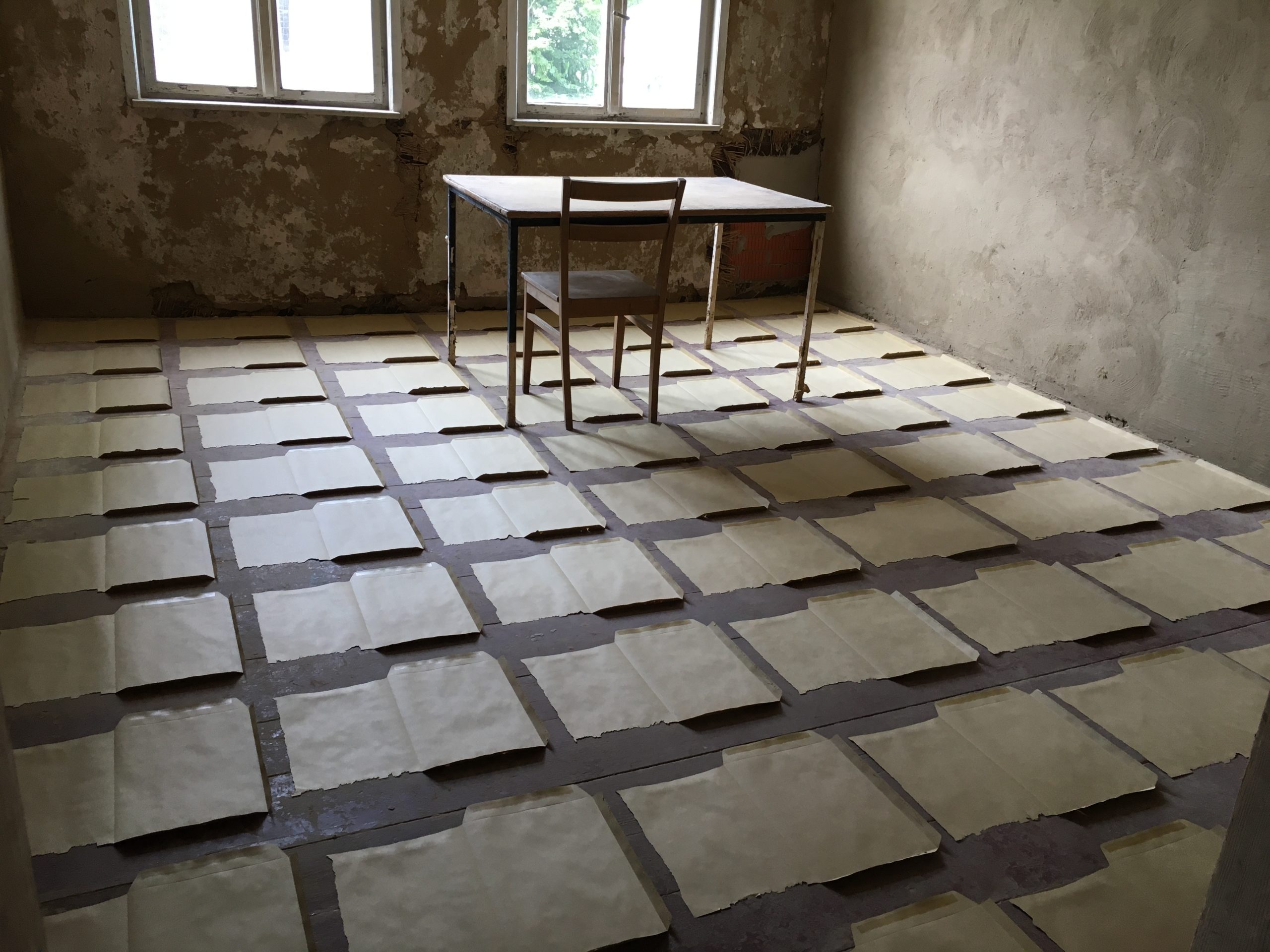 107 Blätter Umschläge liegen auf dem Boden der zwei Räume verteilt. Diese wurden mit dem Cutter zerrissen und zeigen völlig offen ihre Innenseite. Die geöffnete Form erinnert an einen Grundriss eines Raumes. Diese Arbeit ist inspiriert von meiner eigenen Lebenserfahrung, in der ich versuchte, mich anzupassen, indem ich mich zunächst neuen Umgebungen und Menschen öffnete.