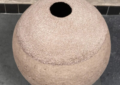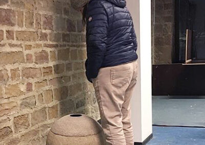 Die große Kugel der Arbeit wurde aus Umzugskartons gefertigt, die ich bei meinem Umzug verwendet habe. Im Inneren der Kugel wird ein Video projiziert, das in Berlin, meinem ehemaligen Wohnort, und Saarbrücken, meinem neuen Wohnort, aufgenommen wurde. Das Video ist mit Animationen durchsetzt, die meine damaligen unruhigen Gefühle visualisieren. Zunächst nimmt der Betrachter nur die Oberfläche der Kugel wahr und bemerkt das Video nicht, da es im Inneren projiziert wird. Erst bei genauer Betrachtung der Arbeit kann das Video durch ein kleines Loch in der Kugel entdeckt werden. Mit diesem Gestaltungselement wollte ich Neugierde wecken, eine grundlegende menschliche Eigenschaft. Durch den Blick auf das Video durch das Loch soll der Betrachter die Erfahrung machen, in die Innenwelt eines anderen Menschen einzutauchen.